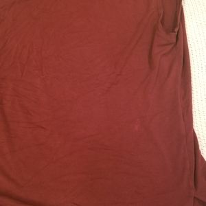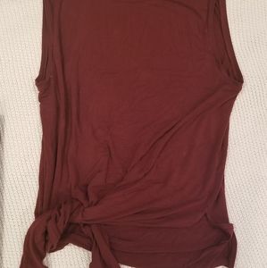 Size small maroon side tie Fabletics top. Untied, it's long, and with a belt would be a cute top with leggings. Tied up, it makes a lovely gym top. I bought this top on here, and it was a little too big for me. My loss is your gain! There is a small discoloration on the left side, but when it's being worn you don't notice is because of the ruffles the knot makes.