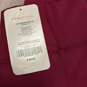 Brand-new with tags Fabletics high wasted pure luxe ruched 7/8s leggings in a wine or lighter burgundy color. These are chafe resistant, moisture wicking, have all way stretch, internal pocket for key or card, and shirred details. I love the look of these and their buttery soft feel makes them incredibly comfortable. You’ll never want to take these off. Small, brand new with tags.