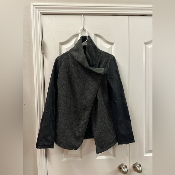 Wool and faux leather jacket with one button closure, zippers on bottom of sleeves, true to size.
