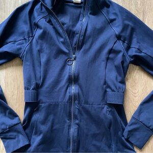 navy blue, zip-up jacket, mesh back, athletic wear, stretchy fabric, fitted silhouette, Lululemon style, sporty outerwear, lightweight, active lifestyle
