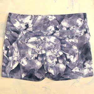 Fabletics medium workout shorts in gray & white. Mid- high rise compressive material. 2.5” inseam. Great shape.