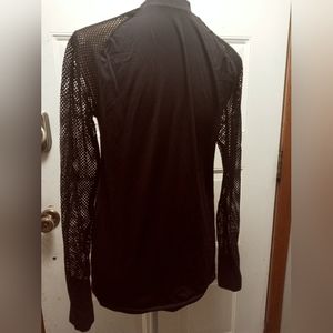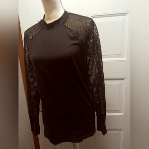 good condition Fabletics black, stretchy workout top with mesh, fishnet sleeves. has thumb holes. size medium but can fit large.