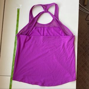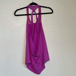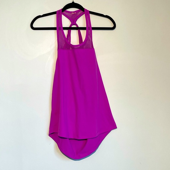 Fuchsia cross/open-back workout tank top. From Fabletics by Kate Hudson. Gently used with no stains or damage. Fits size small (4-6).