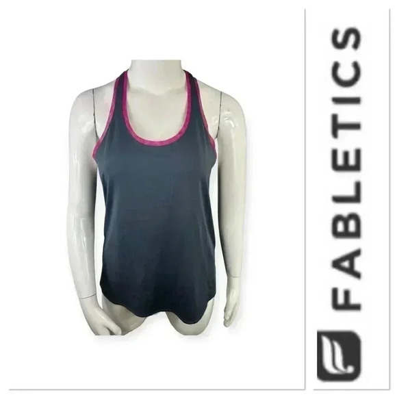 Fabletics Top. Athletic/workout top. Tank top style. Black with pink/purple mesh. Racer back. Excellent preowned condition. Steamed and sanitized. Size XL.