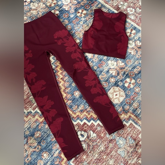 Fabletics leggings and cropped top matching set. Re-thrifting so I’m not sure the size since there are no tags. Fits like a medium. Thicker quality material. Very small hole in the groin area