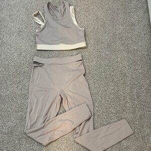 Fabletics beige and gold set. Leggings feature cutouts on hips. Layered style medium impact bra. Never worn, NWOT