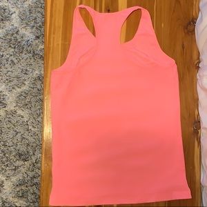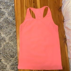 Fabletics Sync seamless tank. New without tags, never worn. Fitted, cute mesh detail on shoulder straps and along upper back. More of a coral color than pink.