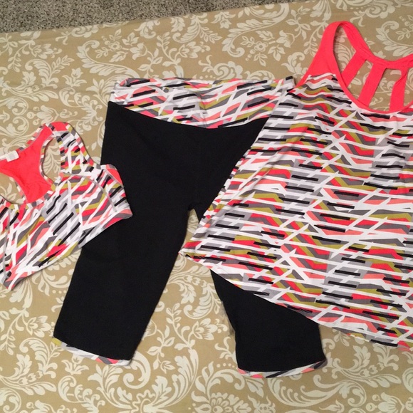 Not for sale. This double posted - I only had one outfit and that none is sold. Work out set from Fabletics. So cute and comfy for workouts. Pants are cropped just below the knee. Great for any type activity. Colors are so amazing. Three piece set. Coral color is very pretty!