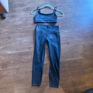 Small bra top and XS leggings (both fit more like a small I think). Leggings are 7/8 length. Black material with a slight sheen. In excellent condition! Can sell separately upon request.
