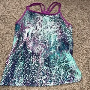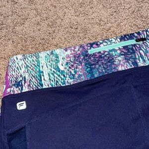 Fabletics set. Size medium. Navy with colors. Great looking set. Top has a padded shelf bra. Pads are included. (I have a matching different style matching top in a listing that you can switch out if you like that style better)Bottoms go right under the knee. Back waistband zipper pocket. Pet free smoke free home.