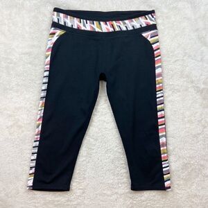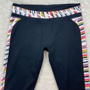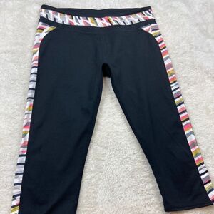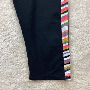 These leggings are in excellent condition. Featured with a cropped fit and a striped colorful pattern down the legs. Black in color and size medium. Made from polyester and elastane. Please send any offers or questions!