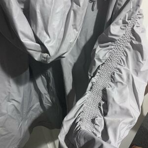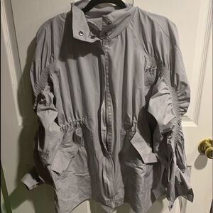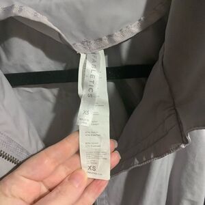 Nice jacket Size xs more small or medium Gray Very nice light weight jacket Removable hood
