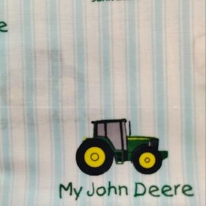 This fabric is a cute blue striped fabric with John Deere symbols. 1 1/2 yards and 44 inches wide.