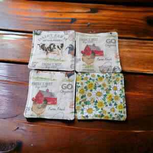 Fabric Coasters, Set Of 4, Reversible Farm Animals and Floral With Bees