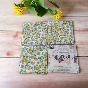 Fabric Coasters, Set Of 4, Reversible Farm Animals and Floral With Bees.