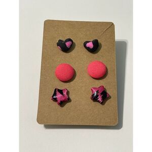 Fabric Covered Button Earring Stud Set Pink Black Set Hearts Stars Round Circles