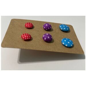 Features: polka dot, round, pink, purple, blue, fabric covered, plastic hypoallergenic posts, button earring