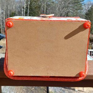 This retro fabric sewing box is great for storing sewing/craft items. Strong resemblance to the retro Singer sewing boxes sold online. Padded fabric exterior decorated with whimsical sewing machines, fabric, mannequins. Handle and edges are wrapped in a thicker, ribbon-like material. Magnetic flap closure.. Interior is equipped with a removable clear sectioned tray. Pin cushion and a pocket on inside lid. Exterior measures easures approximately 9.5" x 7" x 5.25" high, without handle; interior approximately 8.25" x 5.75" x 4", with tray removed. Very gently used. No stains/holes/issues. In excellent condition.