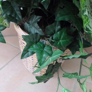 Multi-tone green fabric foliage arrangement with ivy leaves on the bottom section in a beige basket planter. Condition is ‘Like-new’. Arrangement size is up to 41” high & up to 22” wide due to foliage. Basket size: height: 9” & diameter: 12”.