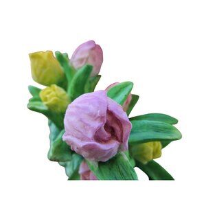 This charming Easter Bunny figurine captures a delightful scene where a playful bunny, dressed in plaid and overalls, tends to his Easter eggs. With vibrant hand-painted eggs and intricate floral details, this piece radiates festive cheer. A cute companion rabbit nestles alongside, adding to the whimsical charm of this collectible.