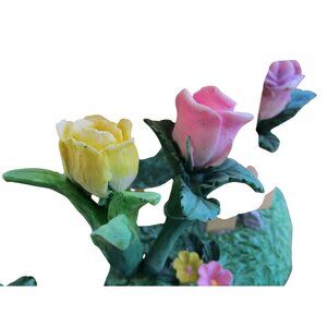 This charming Easter Bunny figurine captures the essence of spring with delightful detail. Clad in a pink floral fabric mache dress, this bunny holds a basket filled with vibrantly colored Easter eggs while standing amidst beautifully crafted tulips. The intricate craftsmanship and vibrant colors make it an eye-catching centerpiece for seasonal decor. 11.5" Tall, 7" Wide.