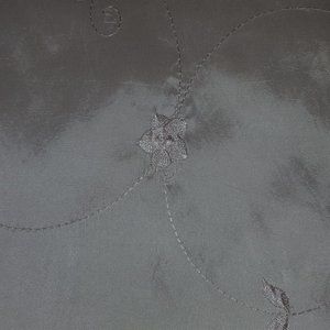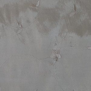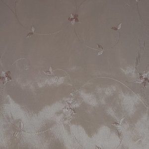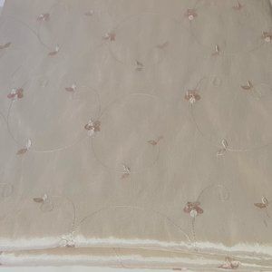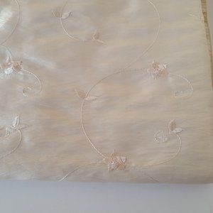 Very good condition. Never used. Beautiful. Champagne color. Unsure of fabric (has a sheen - shine shown in pictures with use of flash) and unsure of care, as this was purchased through a manufacturer's warehouse directly and there were no tags on it. Probably best with glass or plastic topper. Decorative use only. Wrinkly look.Machine embroidered floral design. **NO CARE OR FABRIC CONTENT TAGS**.