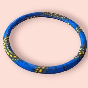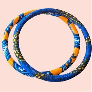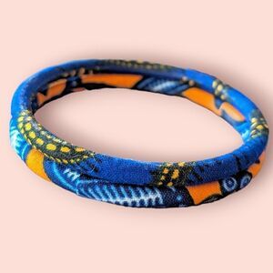 These colorful bracelets are a hard inflexible material wrapped in colorful fabric. Geometric prints in orange and cobalt blue, and cobalt blue and yellow. Inside diameter is 2-5/8". New and unworn, but no tags.