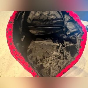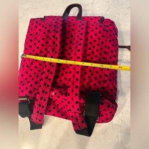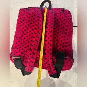 New Fabric backpack Red with black polka dots Brown straps & drawstring Snap closure 14” tall x 12” wide