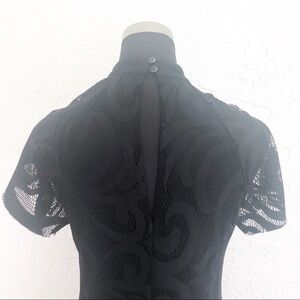 Fabrik Black High Neck Retro Mini Cocktail Dress. Short sleeve style with chicken neckline. Button closure on back. Stretch material