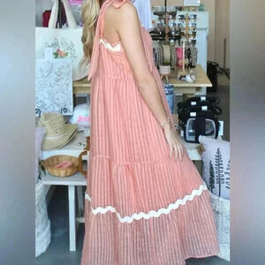 Checkered Textured Lightweight Organza Sleeveless Ribbon Tie Tiered Maxi Dress with Ric Rac Trim & Side Zipper