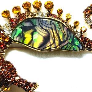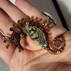 Fabulous Amber Colored Rhinestone & Abalone Sea Horse Gold Tone Brooch Pin