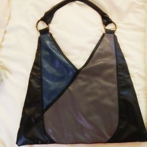 Real leather geometric tri-tone blue, black and gray shoulder bag with inside zipper pocket and snap closure.