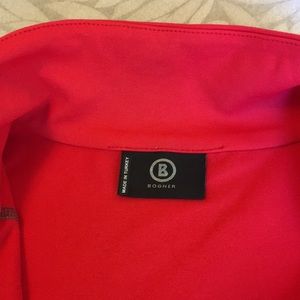 Gently used; Bogner 1/4-zip pullover with signature Silver hardware; Bogner logo in gold with Swarovski crystals on left sleeve; Gray contrasting piping on front, back and on sleeves; Several small spots that may be removable on sleeve and near front zipper; European size 38, but fits like a US size 6. Great piece to wear solo or under a vest or lightweight jacket!!