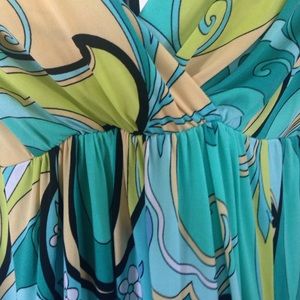 Pleated bodice, v front and back, elastic waist, and POCKETS. Bright bold colors and pattern adorn this dress and it's got a sewn under hem that gives it an extra bounce. I just LOVE this dress and get a plethora of compliments each time I wear it. Essentials by A.B.S.