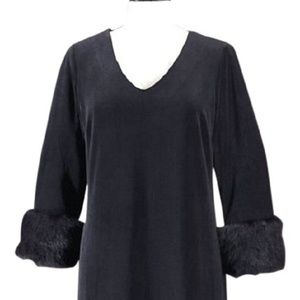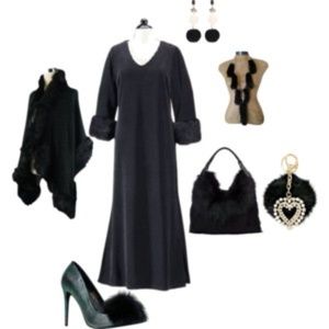 Black Faux Fur Accent Sleeve Velvet velour Lounger Gown Casual Chic Maxi Dress elegant dressed up party holidays boho chic Cruise vacation.