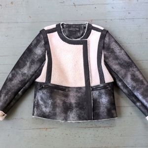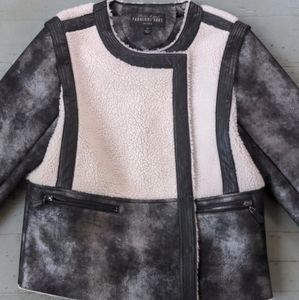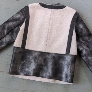 A glamorous mix of black and silver vegan leather and fuzzy sheep like wool. Gorgeous distressed gunmetal metallic suede. Very rare jacket from Miss Salyers.