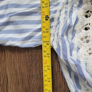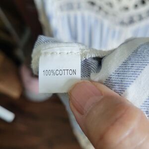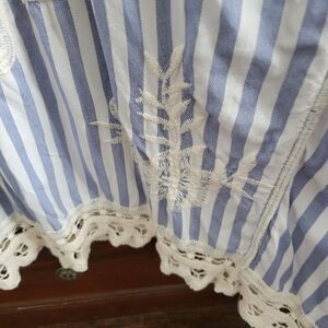 This Fabulous MJ New York blouse is a must-have for any bohemian or cottagecore enthusiast. The cream and blue striped pattern, lacey fabric type, and embroidered accents make it a truly unique piece. With a relaxed fit and collarless design, it's perfect for a day out in the sun or a casual afternoon tea.