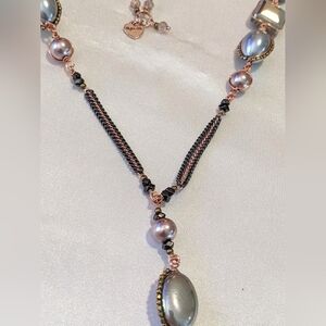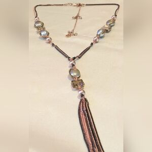 This is a Fabulous Nakamol Mixed Media Fringe Tassel Necklace. Chain details in Rose gold tone, gun metal gray, and gold tone. Has Gray and Pink Faux Pearls and Smokey Crystals. Necklace is adjust from 24*-29" long, with the tassel pendant hanging an additional 7". In excellent condition. Please see pics for details.
