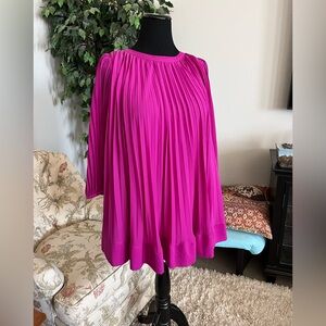 Absolutely fabulous pink chiffon mini dress with pleats all over. The bodice is fully lined, but the sleeves are not. The bottom hem is wide & heavier and gives this piece a beautiful drape and swish. Pullover with a fabric button behind the neck.