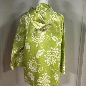Stay dry in wet and windy weather with this vibrant green waterproof, windproof, hooded coat.  The hoodie style has a drop shoulder, with a full hip and patch pockets, NWT, USA, coated cotton exterior and breathable.