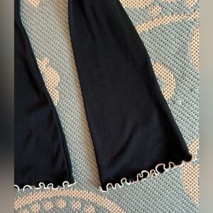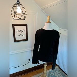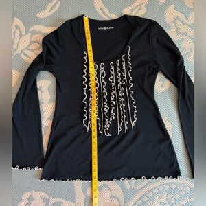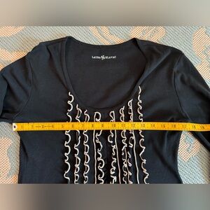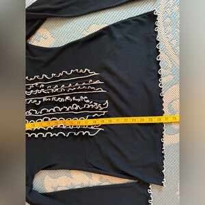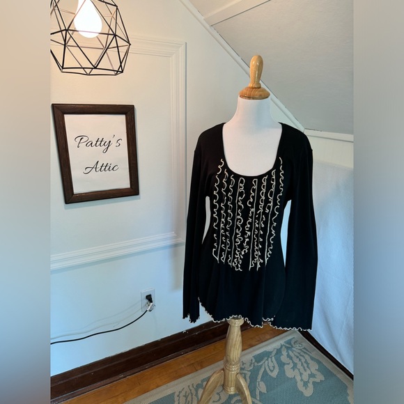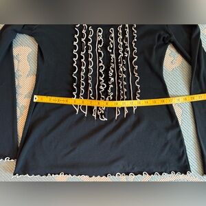 Love this black top with ruffles sewn into the front, hem and cuffs. It has a wider neck and sleeves - super cute style making me question why I’m not keeping it for myself!