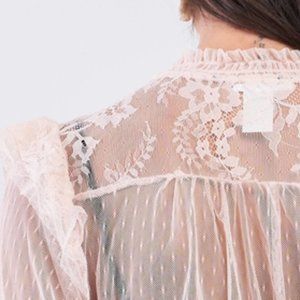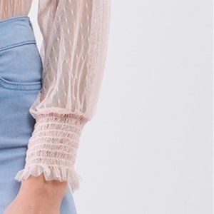 🖤Features: Blush, sheer mesh, polka dot, self-tie mock neckline, long sleeve with smock & frill cuff, ruffle trim shoulder, light stretch, unlined