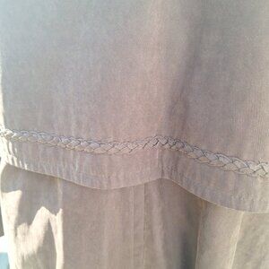 Full front zipper and snaps to close, cuffed sleeves, braided accent at bodice, two outside pockets and one inside breast pocket. Fully lined and has a zippered removable liner. Slit in back. Soft Suede Feel
