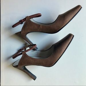 Fabulous, Vintage, Chocolate Brown, Linen Charles Jourdan Heels! Pre- Loved Like New Condition. Leather Elastic Ankle Strap with Slide Closure. Lovely! Size 7