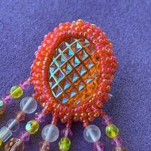 Fantastic one of s kind hand beaded earrings made by Sonoma jewelry artist Lisa Jo Silberkleit. These are vintage and are new old stock. They have a European large ab pressed glass cab at the top in orange and coral blue shades. The cab is surrounded by glass beads and the chandelier strands are crystal, pink , yellow and orange varied glass beads, stunning colors snd design.