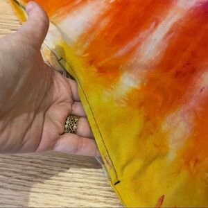 Black dress, with the center reverse tie dyed in rainbow tones of red, pink, orange, and yellow