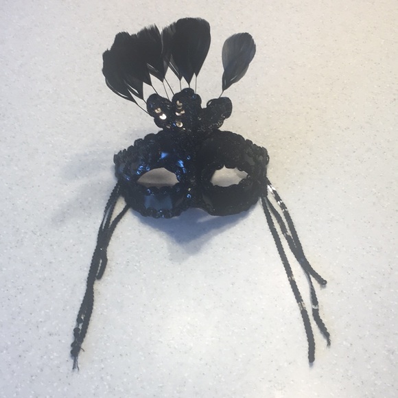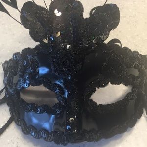 Beautiful face mask metal with black sequence and feather on top, brand new with tags great for parties or decoration for the house