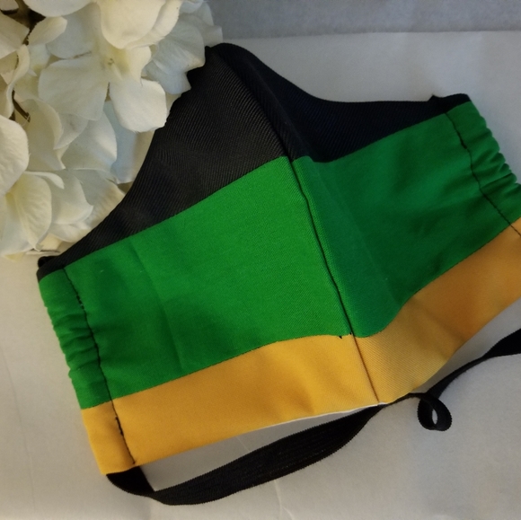 Jamacian full flag mask. Elastic around the head. Custom made. 3 layer of protective fabric.