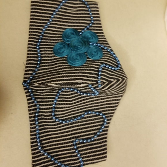 Blue beads . Black and white fabric. Elastic around the head