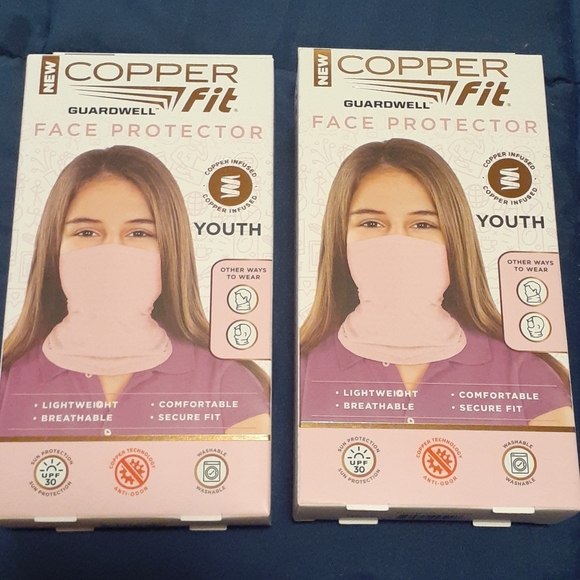 Brand new face protector for youth. Lightweight, breathable comfortable, securefit, sun-protective, & anti-odor copper technology. Washable and rewearable. You can wear it in many ways. Moisture-wicking. New Copper Fit and made by Gaurdwell.
